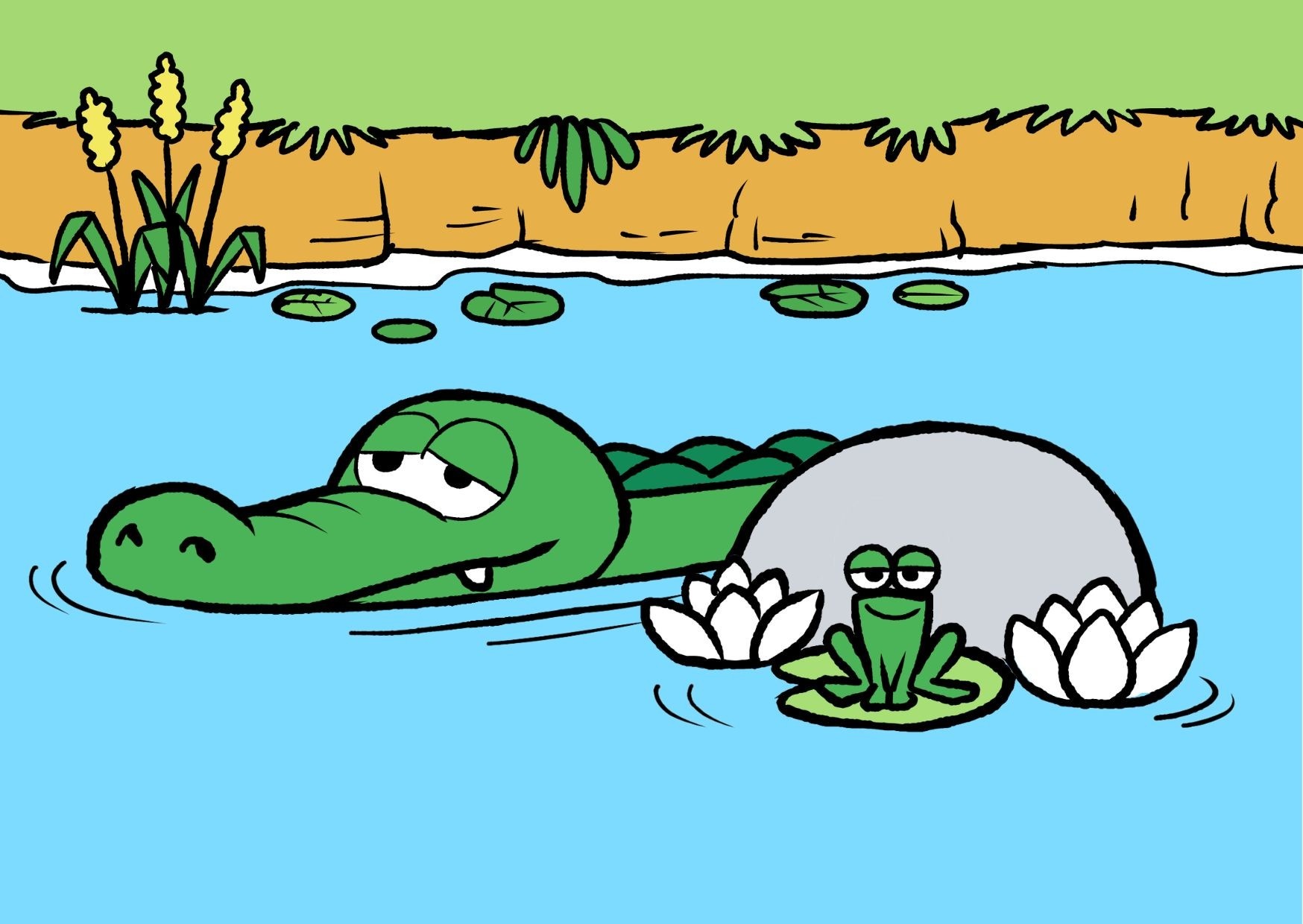 Hallo lieve vriendjes. Krokodil hier. Vandaag vertel ik jullie graag een leuk verhaal. Het gaat over een reis waar ik altijd rustig door wordt. Heel diep in de jungle is een plekje dat bijna niemand kent. Het is de lievelingsplek van Aap, Leeuw, Olifant, Papegaai en mezelf. Het is er wondermooi. Ik neem je mee.
